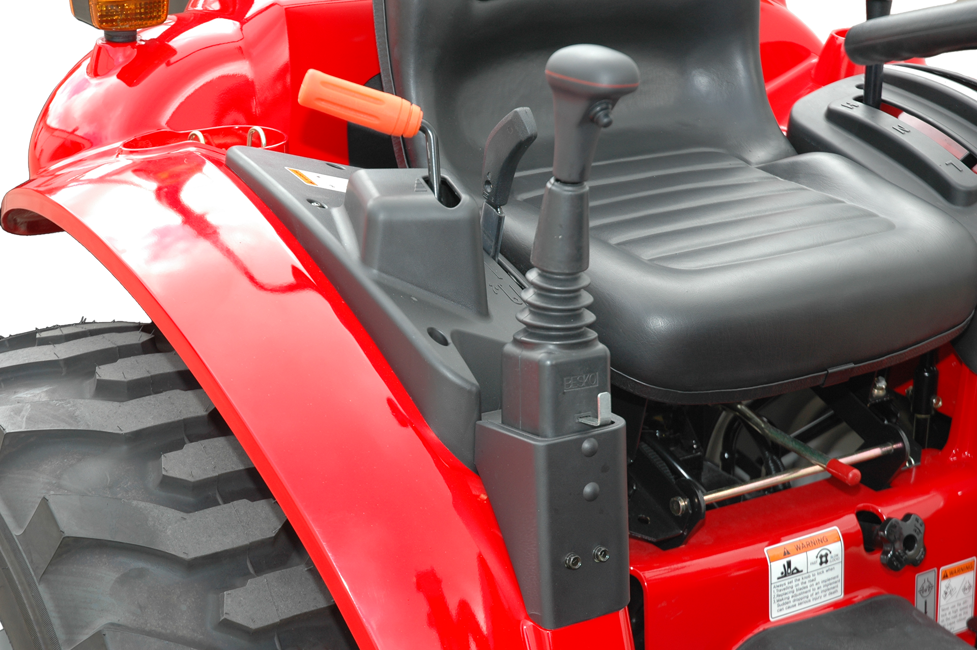 The throttle lever (orange lever) is conveniently positioned next to the steering wheel for quick adjustments. The three-point linkage position lever and a fully integrated single joystick provide intuitive, ergonomic control of the front-end loader, making operation smooth and efficient.